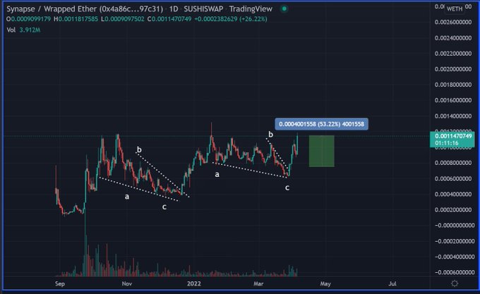 According to Smart Contracter, Synapse is on an uptrend after undergoing a three-wave correction based on the Elliott Wave theory. The Elliott Wave Theory states that the main trend adopts a five-wave pattern while a correction takes on a three-wave pattern.