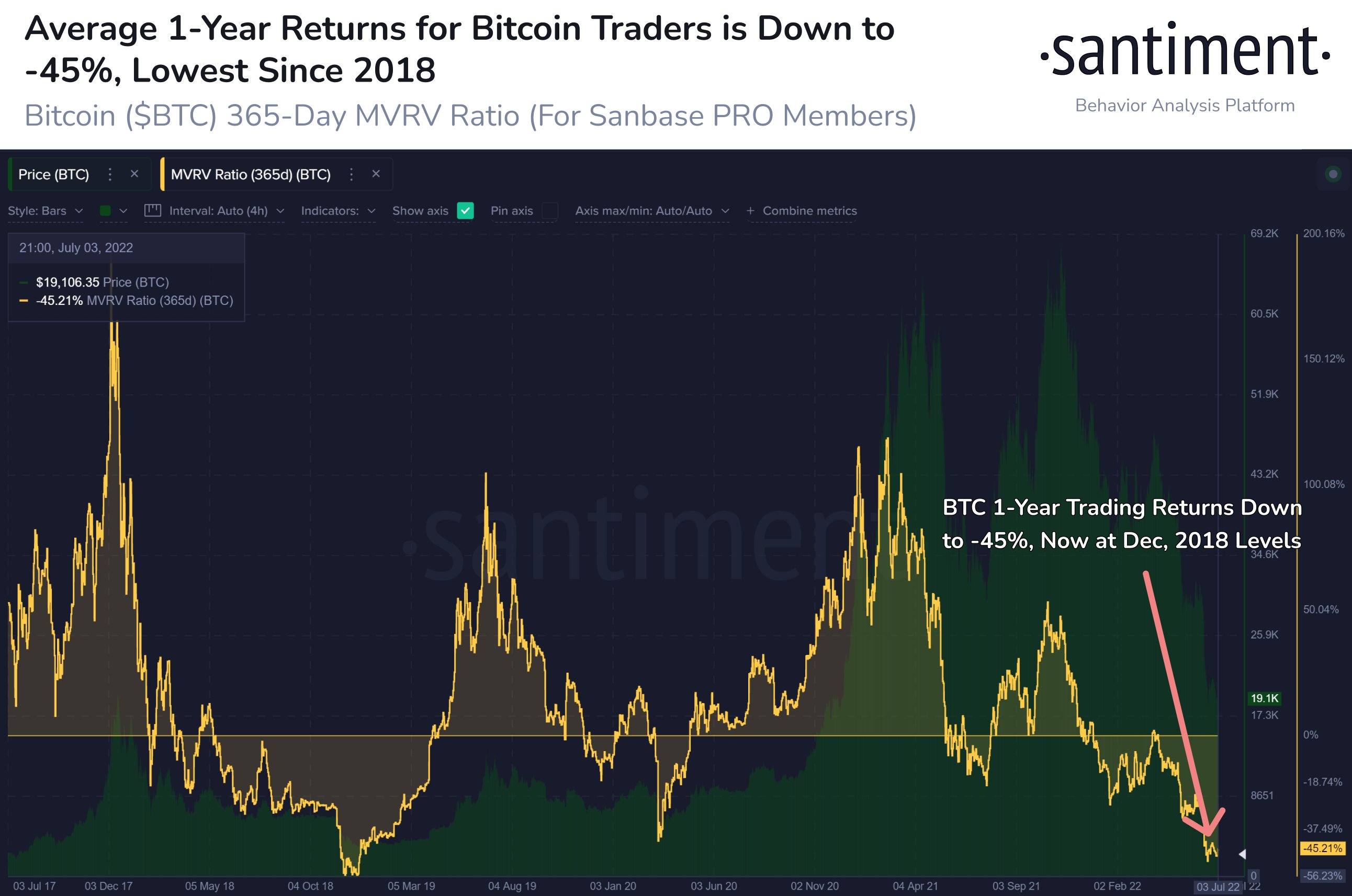 Santiment also notes the 365-day return for the average Bitcoin trader is -45%.