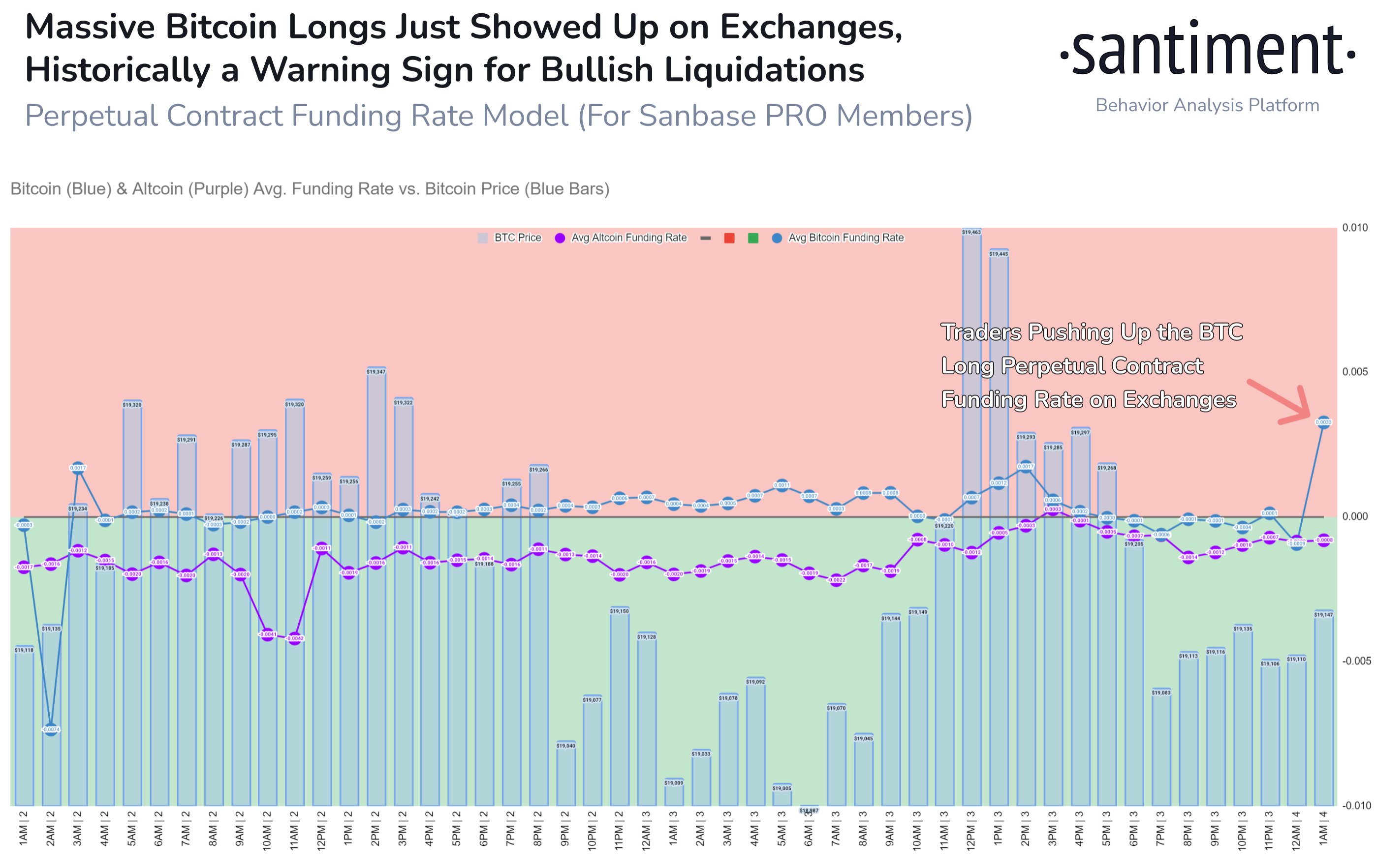Santiment also says Bitcoin (BTC) witnessed a “massive uptick” in longs on exchanges on Monday.