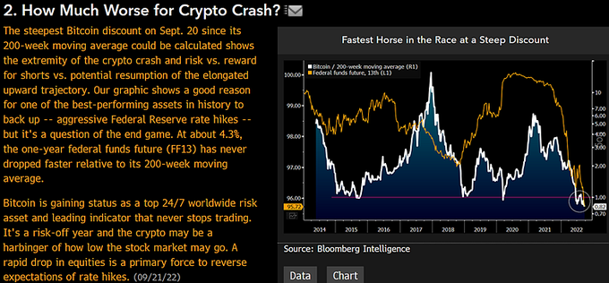 “The steepest Bitcoin discount on September 20 since its 200-week moving average could be calculated shows the extremity of the crypto crash and risk vs. reward for shorts vs. potential resumption of the elongated upward trajectory.”