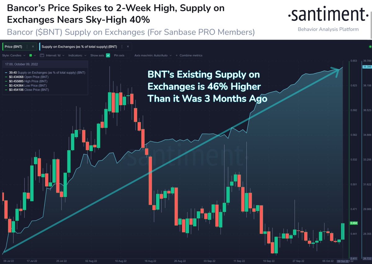 Santiment says the price of the native token of the automated market maker (AMM) Bancor (BNT) is rallying as the token’s supply on exchanges increased by 46% from three months ago.