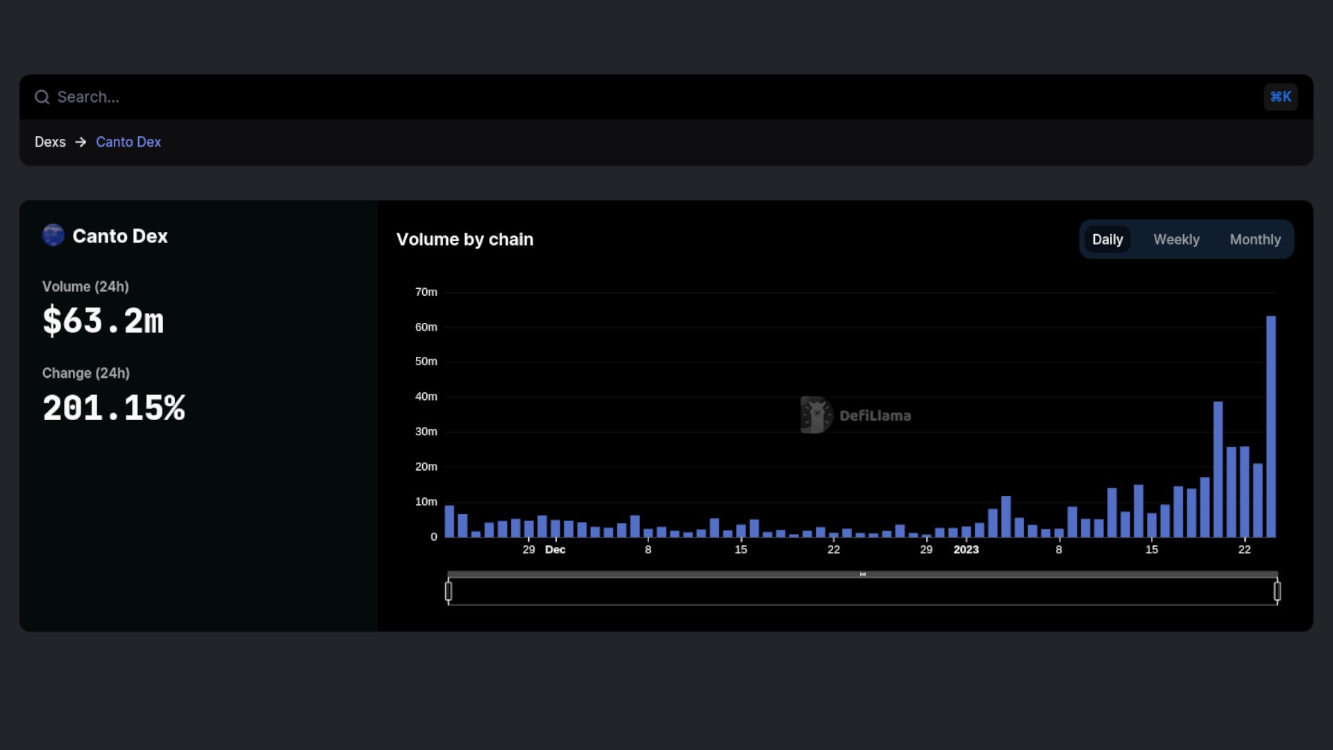The decentralized finance (DeFi) tracker DeFi Llama notes that Canto’s decentralized exchange (DEX) saw $63.2 million in daily trading volume on Tuesday, a more than 200% increase from the previous day.