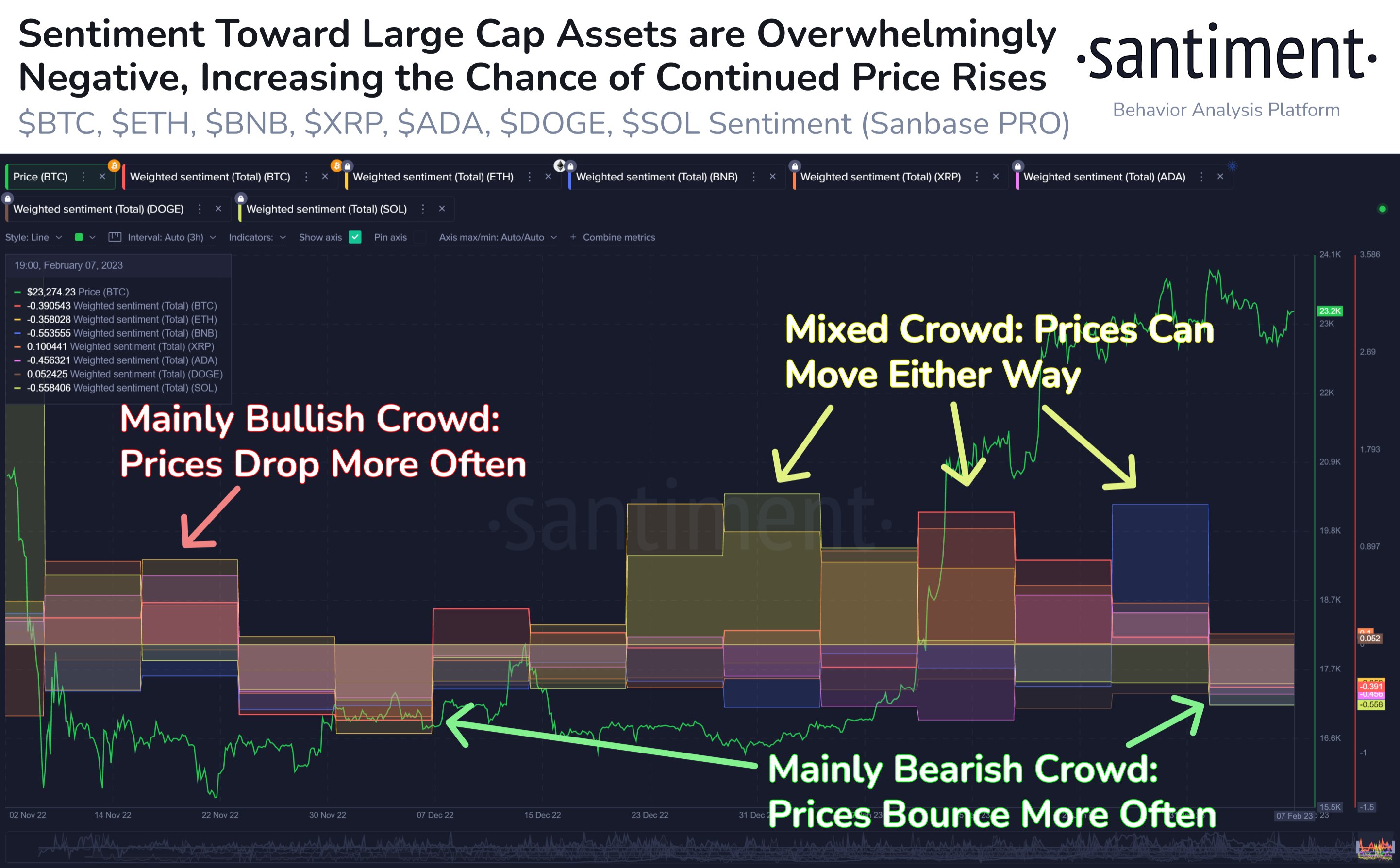 Santiment points to sentiment on Ethereum (ETH), Binance Coin (BNB), XRP, Cardano (ADA), Dogecoin (DOGE) and Solana (SOL) as particularly negative.