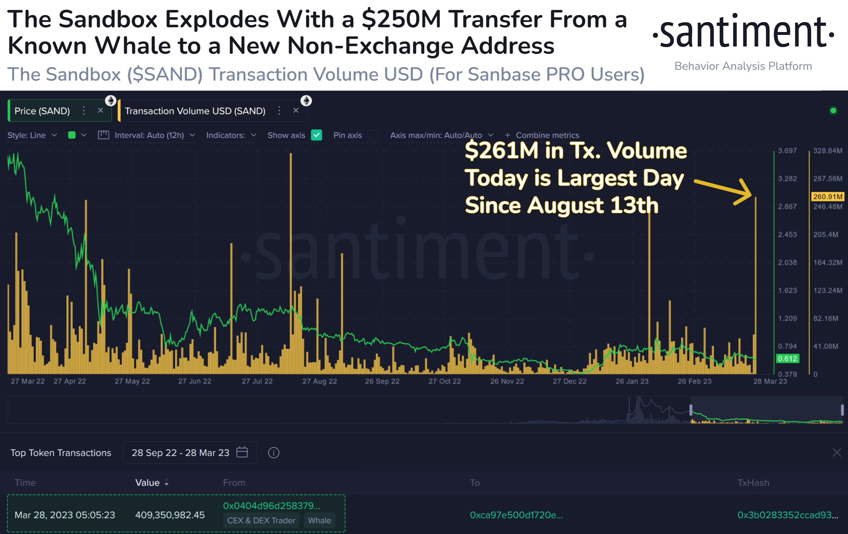 The largest transaction involved one unknown wallet sending 409,350,982 SAND worth more than $247.3 million to another unknown wallet, according to the blockchain tracker Whale Alert.