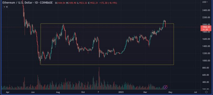 The analyst also says that ETH has moved back into a 300-day range, suggesting that Ethereum’s recent breakout could be a bull trap.